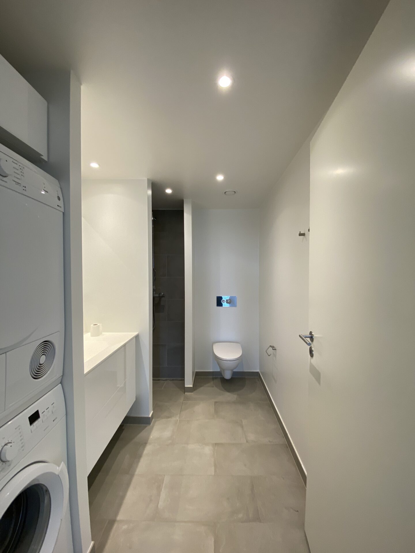 Badeværelset er rummeligt og praktisk indrettet med vaskesøjle, så du nemt kan klare vasketøjet.