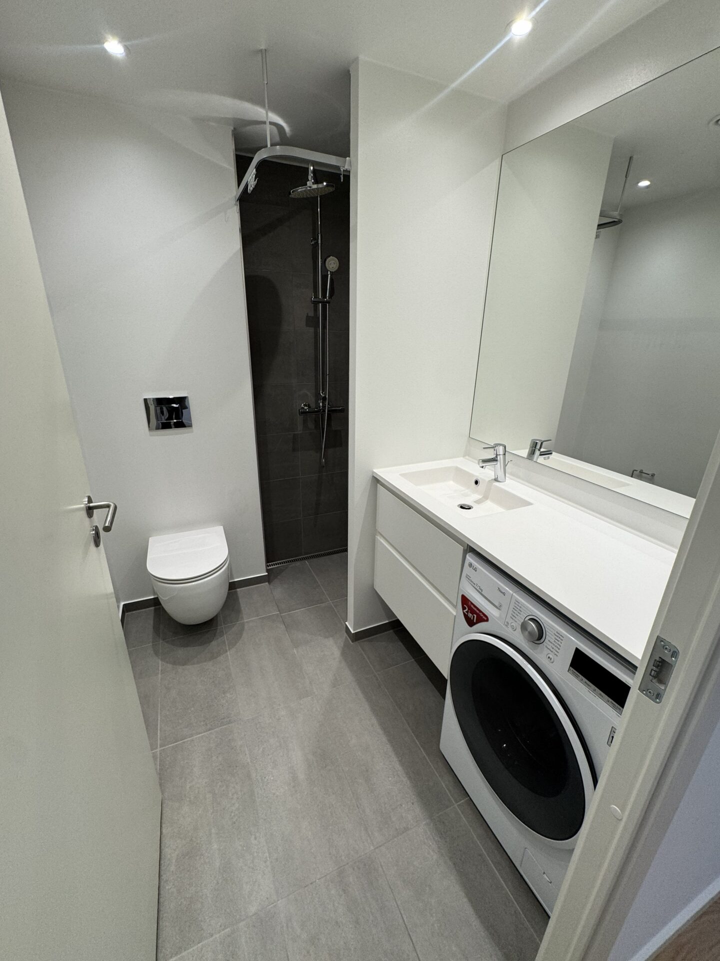 Badeværelset er rummeligt og med en kombineret vaskemaskine, så man undgår vasketider og en vaskekælder.