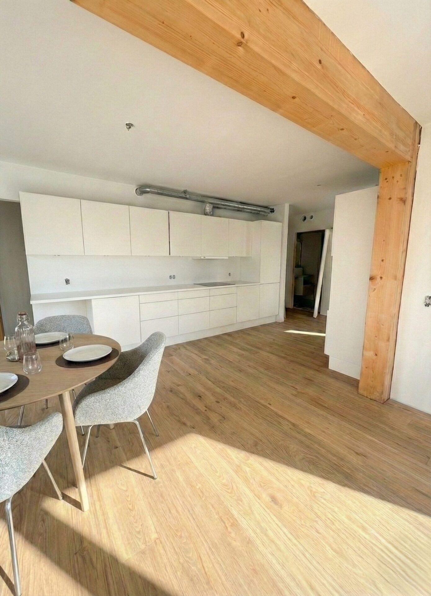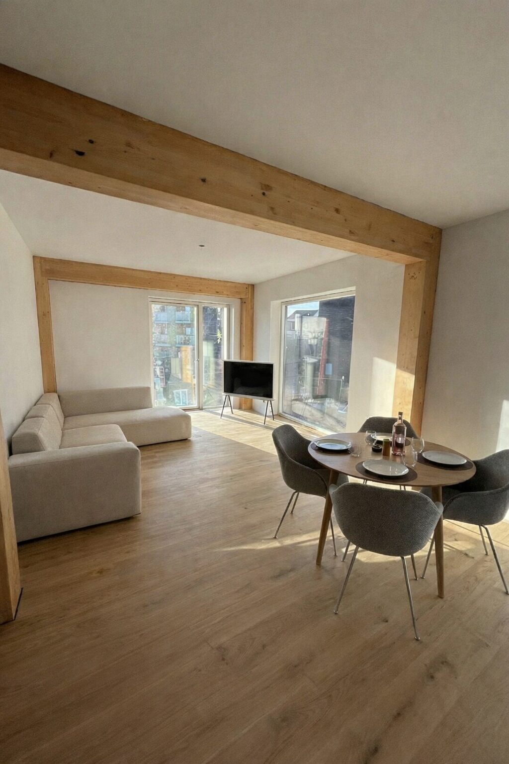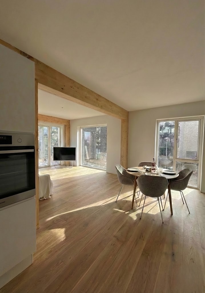 Vores nye byggeri på Tove Ditlevsens Gade rummer 58 nye lejligheder, som står indflytningsklare til marts 2026. Byggeriet er opført med i en bærende konstruktion i rent træ – Danmarks første. Inde i lejlighederne bliver de smukke, synlige træbjælker et helt særligt kendetegn og giver hjemmene en varm og naturlig atmosfære.