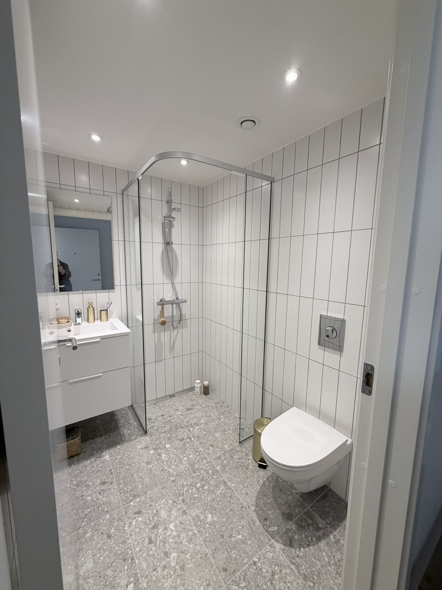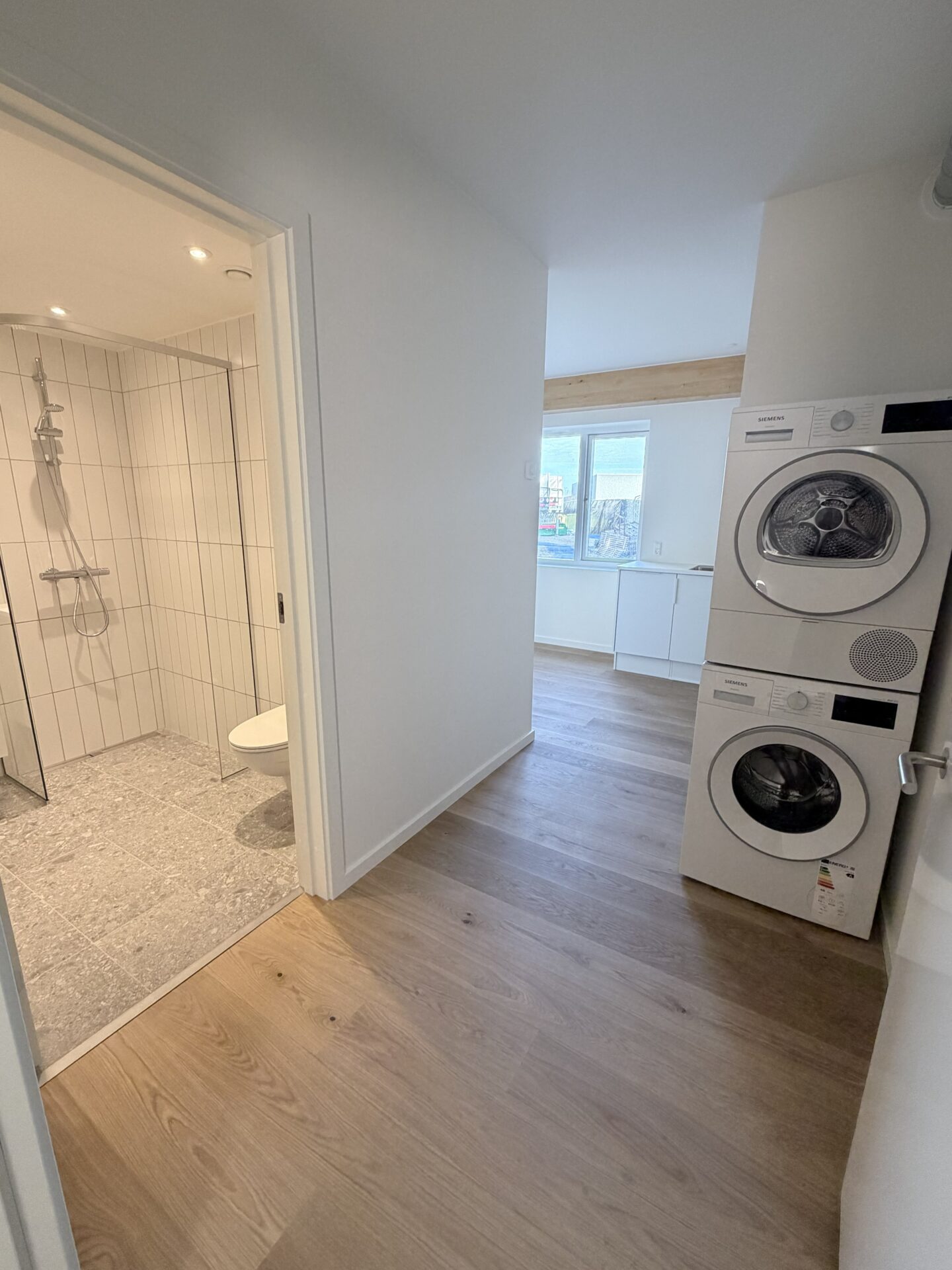 Her er et lyst skandinavisk SVANE køkken, med opvaskemaskine, og et eksklusivt badeværelse, som giver boligen et moderne udtryk.