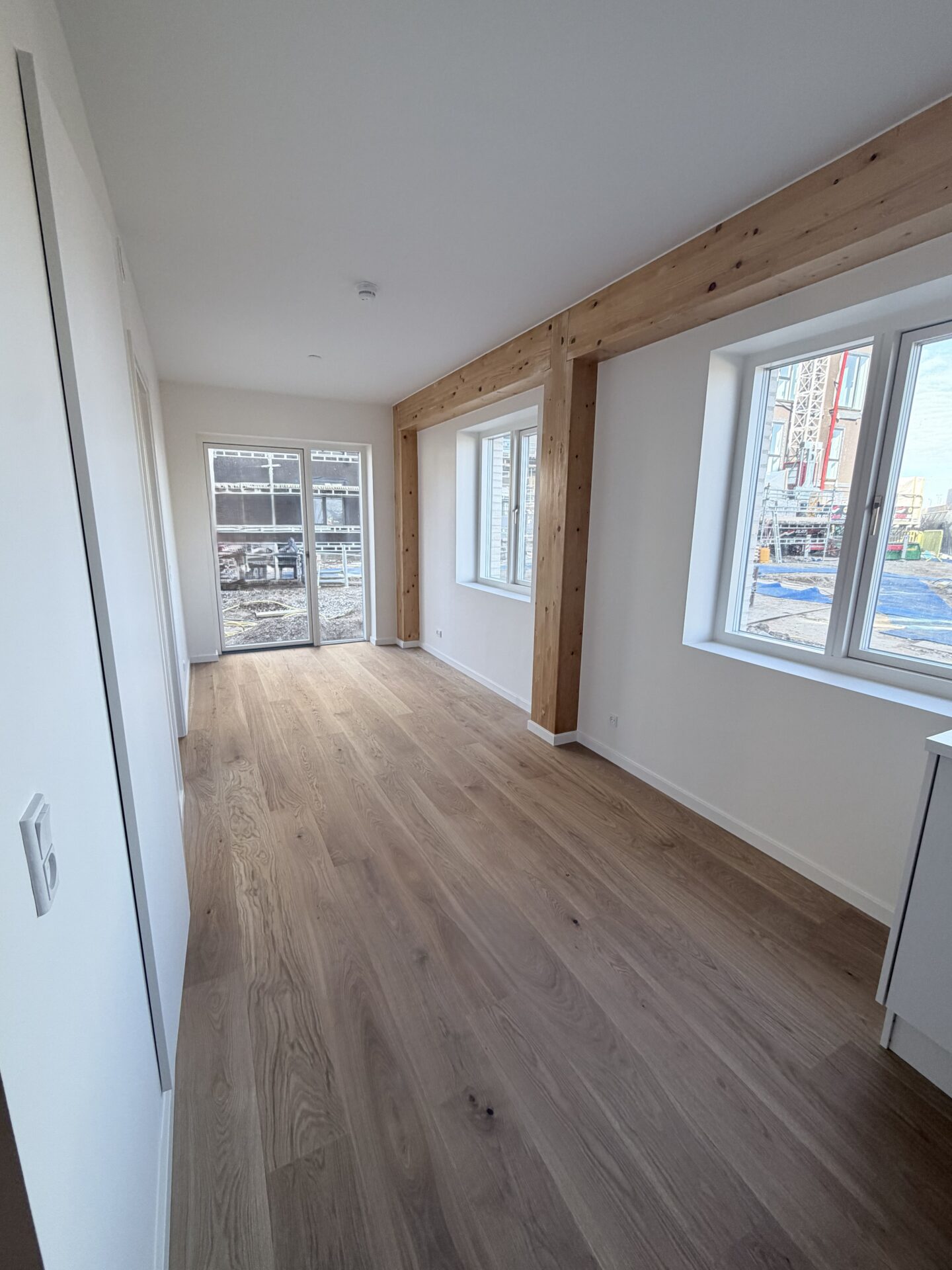 Vores nye byggeri på Tove Ditlevsens Gade rummer 58 nye lejligheder, som står indflytningsklare til marts 2026. Byggeriet er opført med i en bærende konstruktion i rent træ – Danmarks første. Inde i lejlighederne bliver de smukke, synlige træbjælker et helt særligt kendetegn og giver hjemmene en varm og naturlig atmosfære.