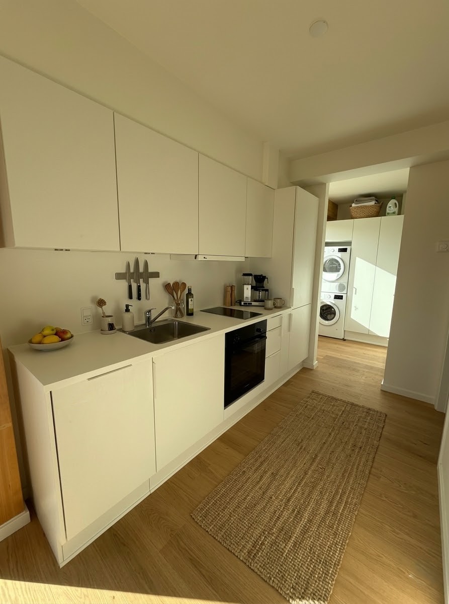 Køkkenet er med opvaskemaskine og i entréen er det skabsplads til opbevaring, hvor der hvor der også er vaskemaskine & tørretumbler.