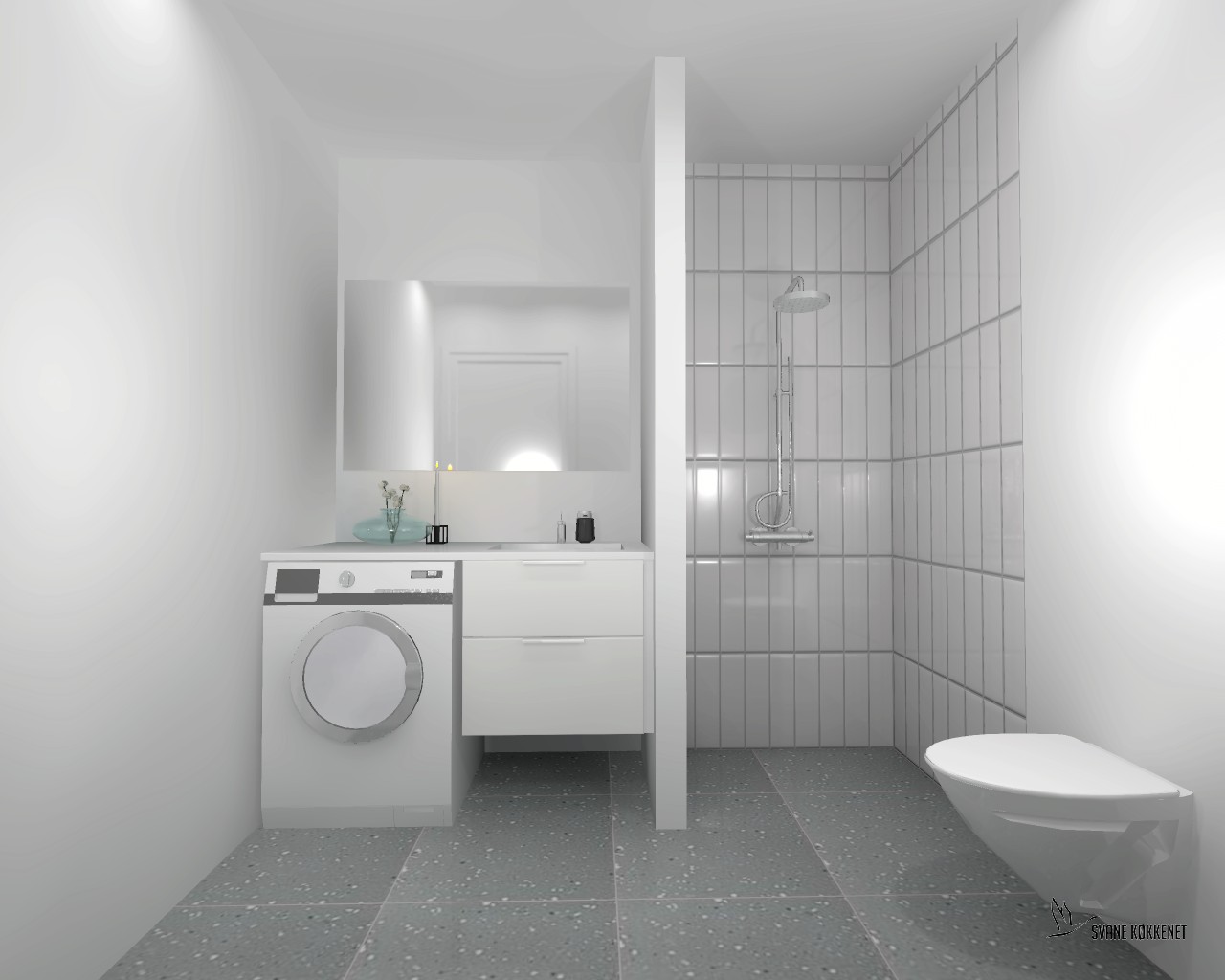 På badeværelset er der vaskesøjle, så man slipper for vasketider og kælderrum.