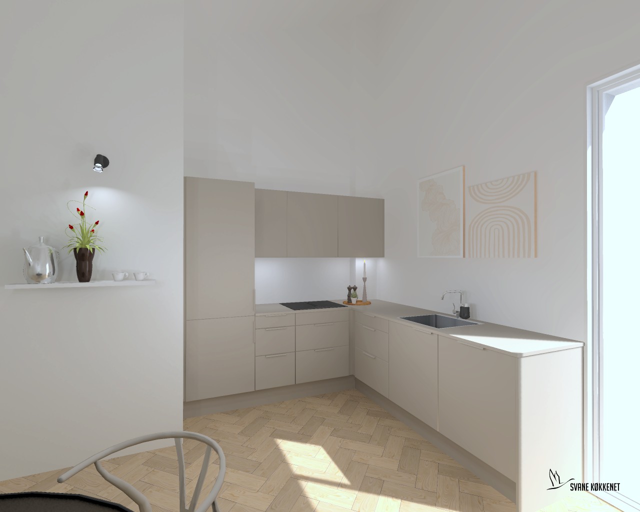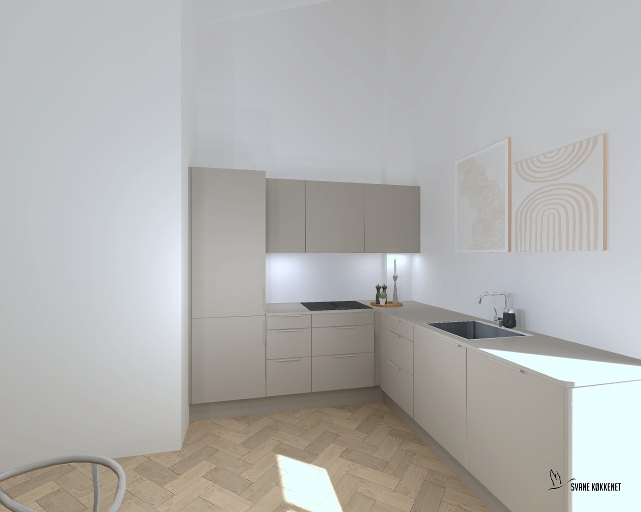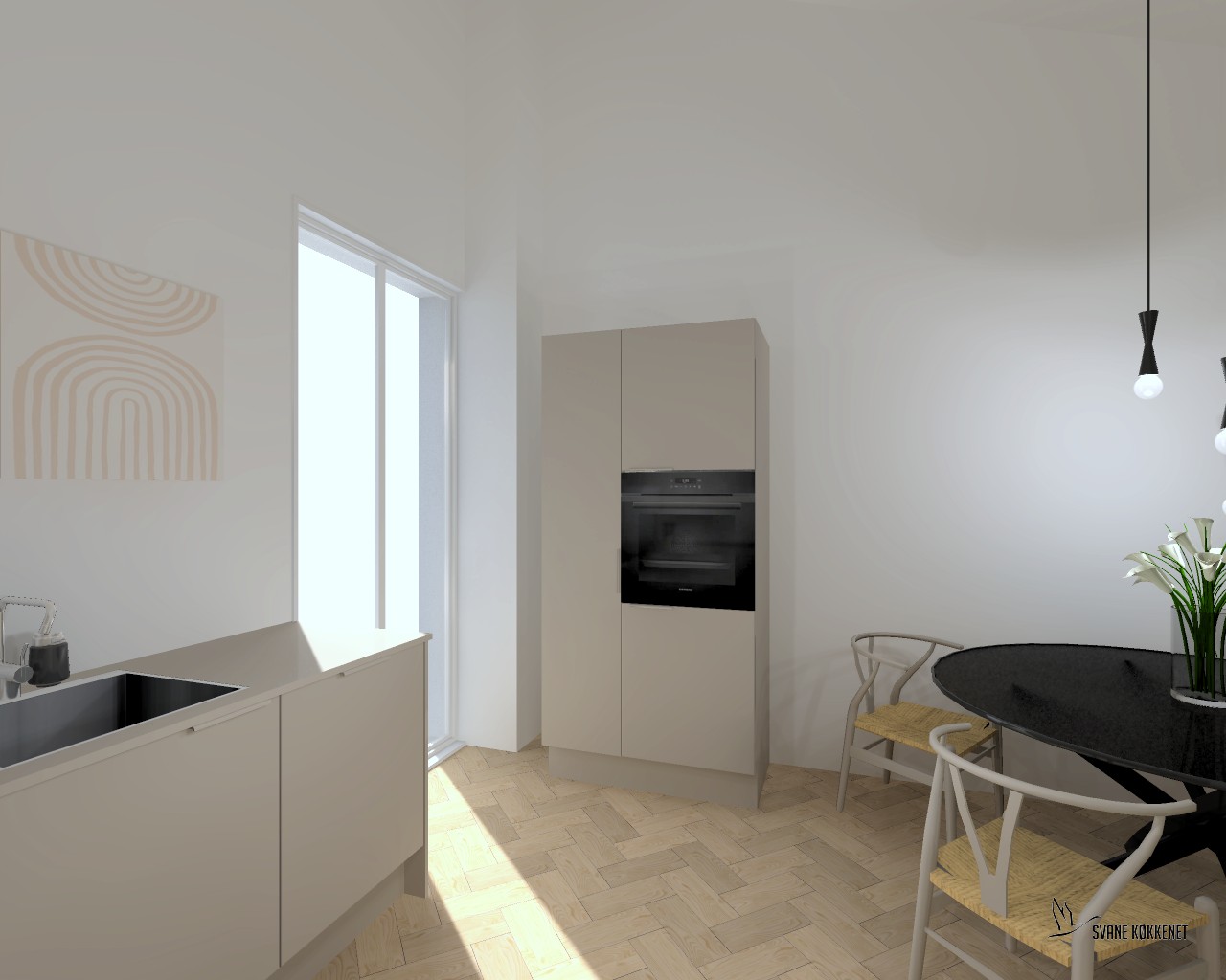 Lejligheden er indrettet med et stilrent køkken i skandinavisk design og et rummeligt badeværelse med integreret vaskesøjle. Der lægges smukt sildebensparket og gulvvarme i hele boligen, som skaber en elegant og behagelig atmosfære.