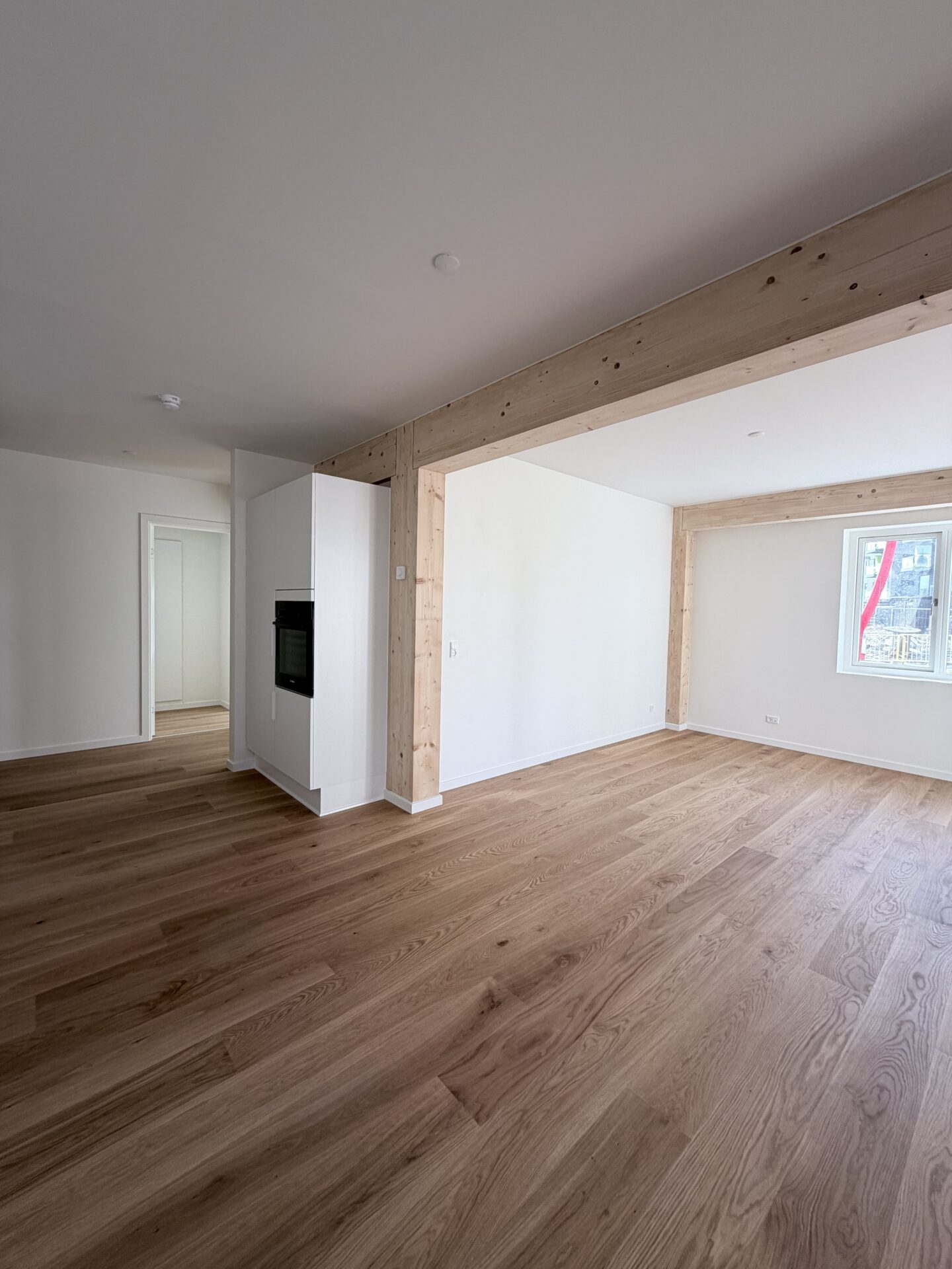 Rummelig 5-værelses lejlighed med åbent opholdsrum med god plads til at samles hele familien. Fra opholdsrummet er der udgang til en hjørneterrasse – her vil blive opført rivenet rundt om terrassen. I opholdsrummet er der også fine træbjælker som giver et fint udtryk.